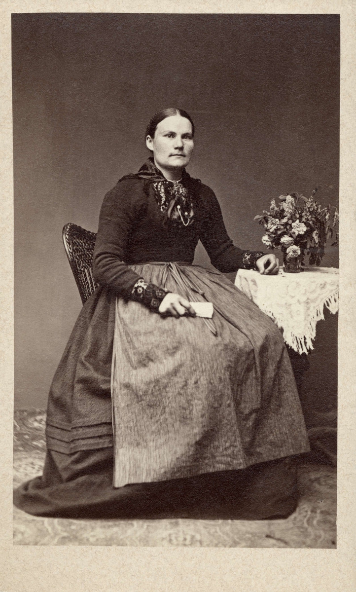 Kvinna sitter vid ett bord, poserar i en folkdräkt