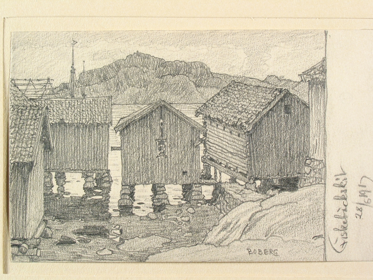 Bohuslän, Fiskebäckskil. Strandbodar. Teckning av Ferdinand Boberg