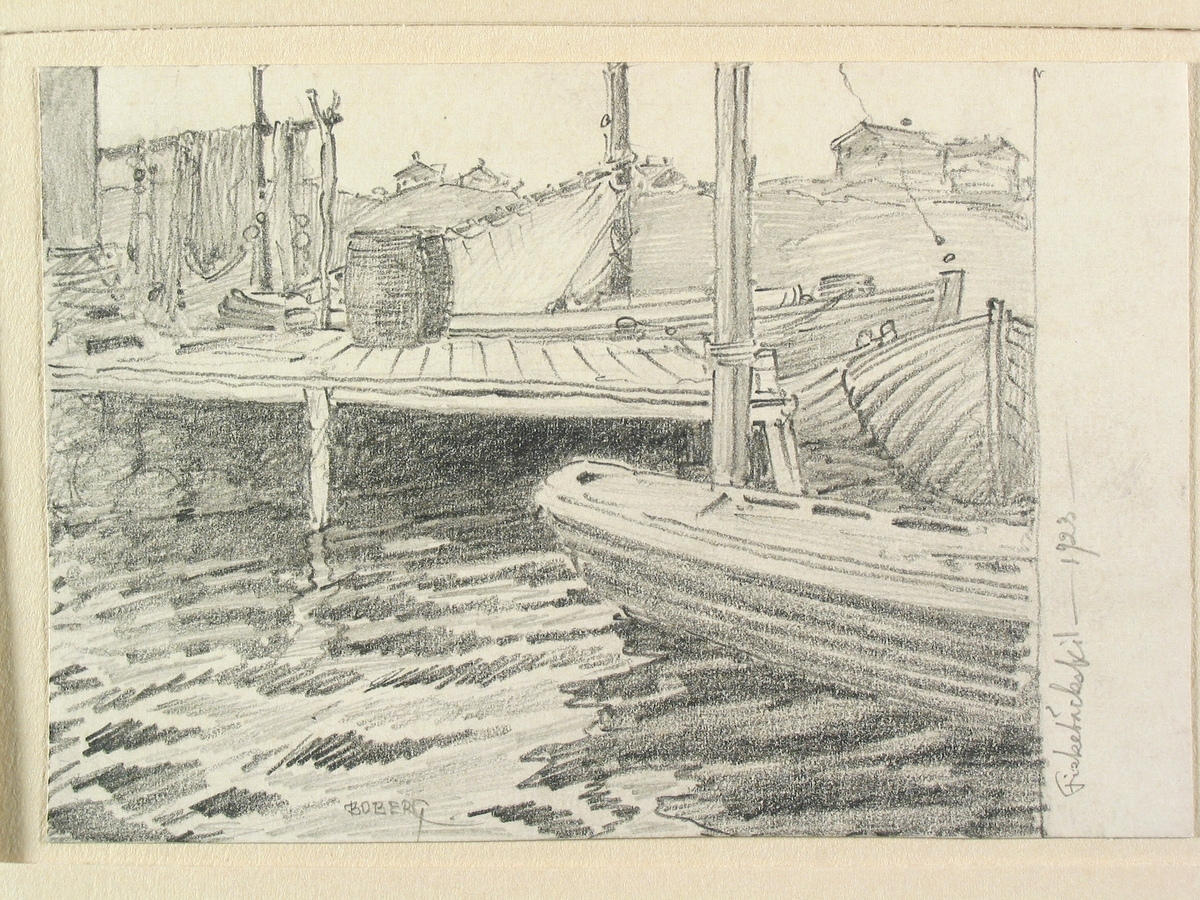 Bohuslän, Fiskebäckskil. Båtar vid brygga. Teckning av Ferdinand Boberg