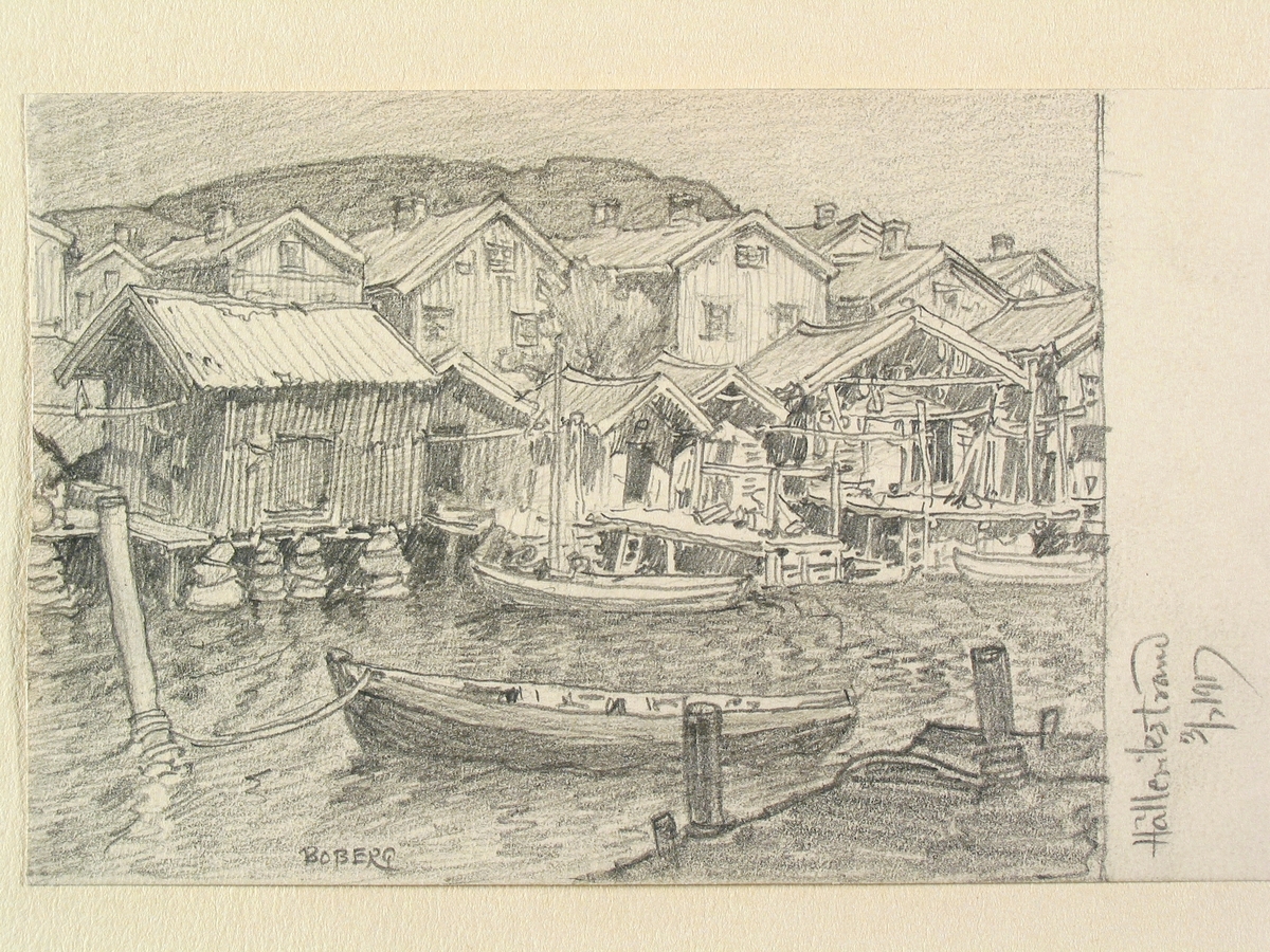 Bohuslän, Hällevikstrand. Hus, bodar och båtar vid bryggorna. Teckning av Ferdinand Boberg