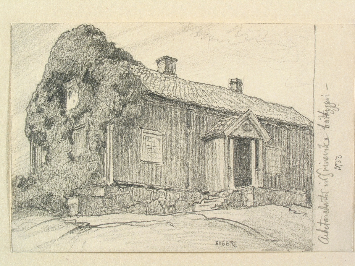 Bohuslän. "Arbetarebostad vid Svineviks båtbyggeri". Teckning av Ferdinand Boberg