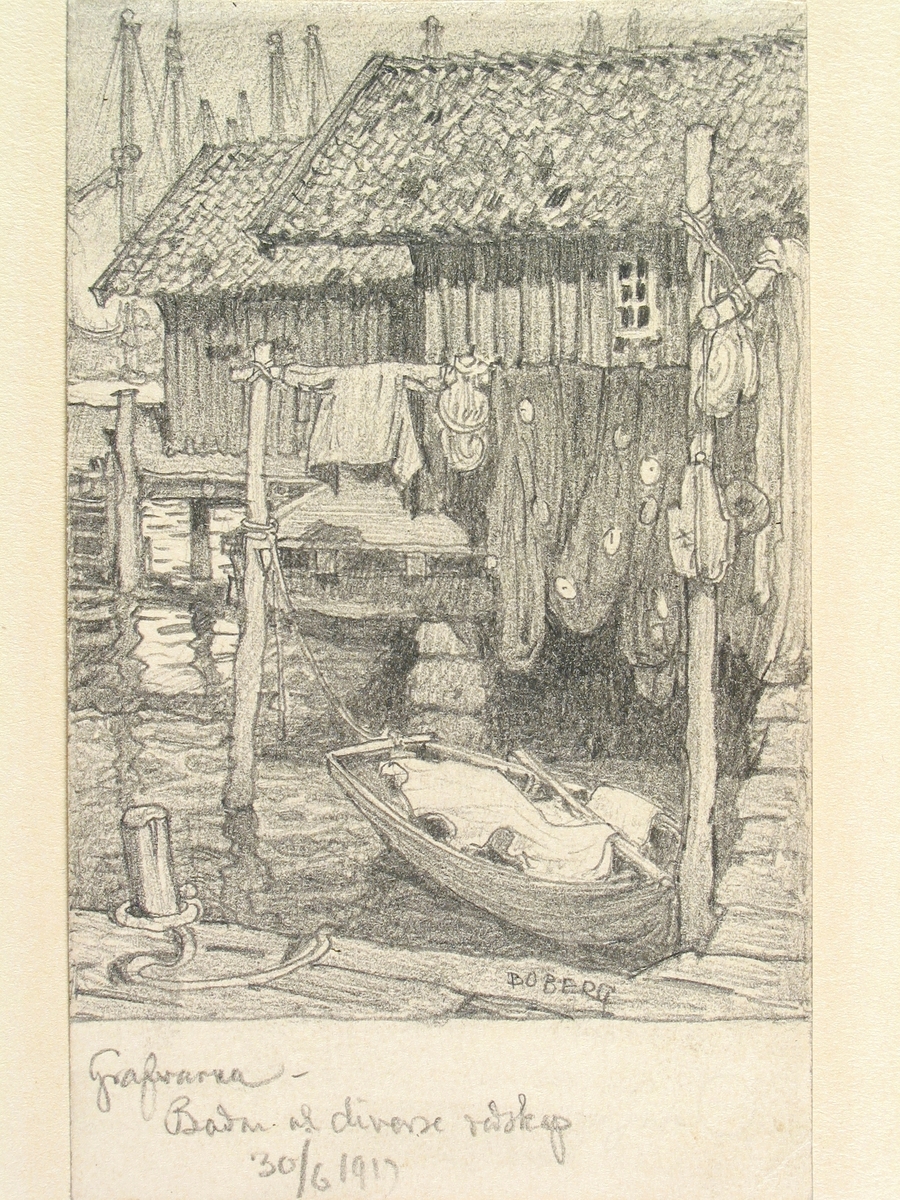 Bohuslän, Gravarne. Teckning av Ferdinand Boberg. Bodar, upphängda fiskenät, roddbåt.