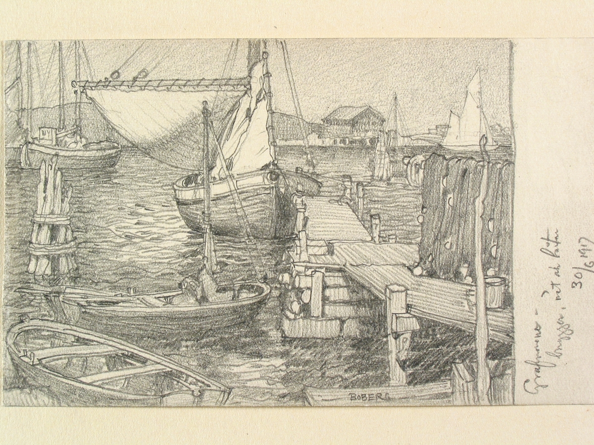 Bohuslän, Gravarne. Brygga, upphängda fiskenät och båtar. Teckning av Ferdinand Boberg