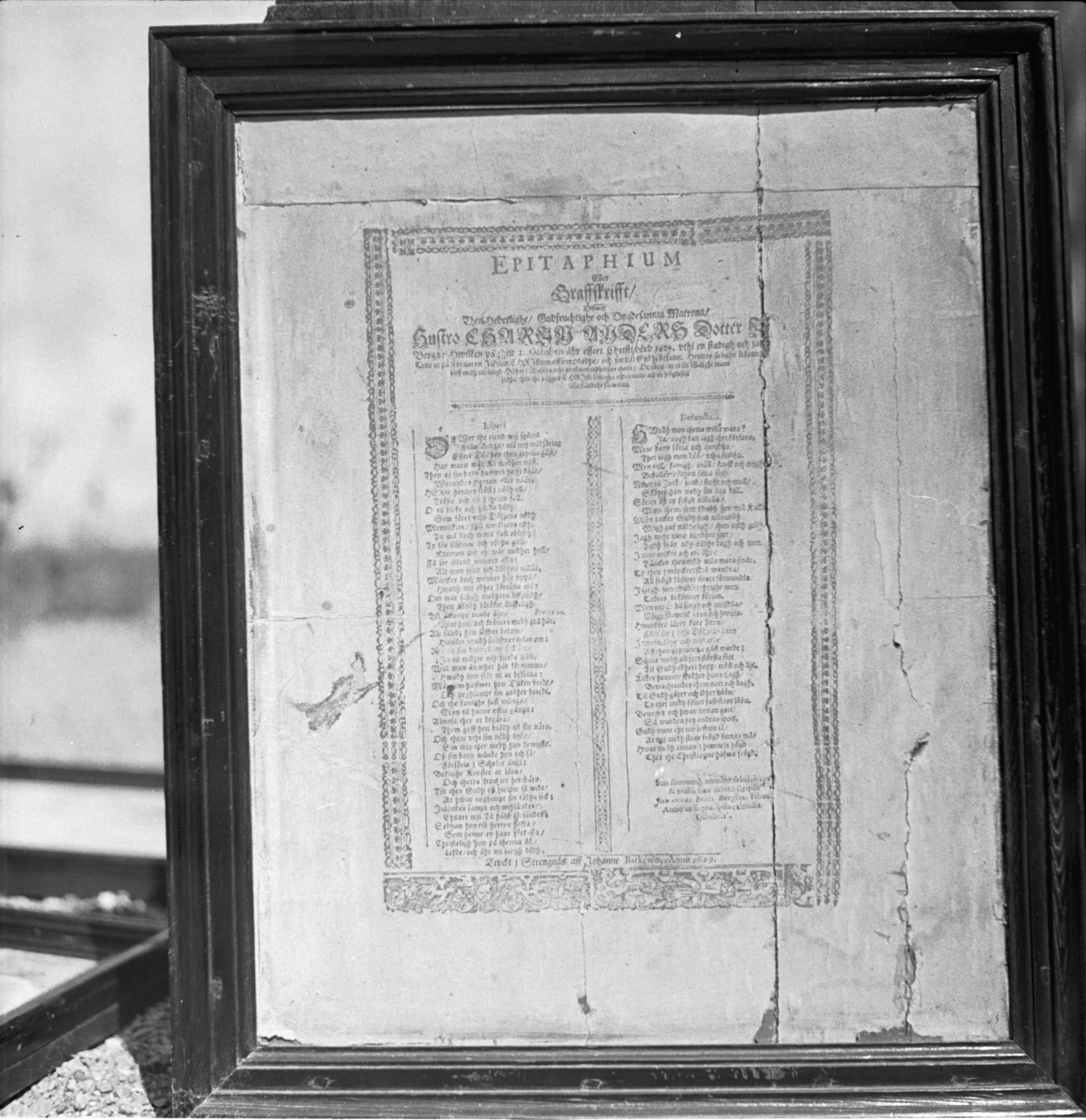 Gravskrift över Carin Andersdotter, inom svartmålad träram, tryckt 1629.