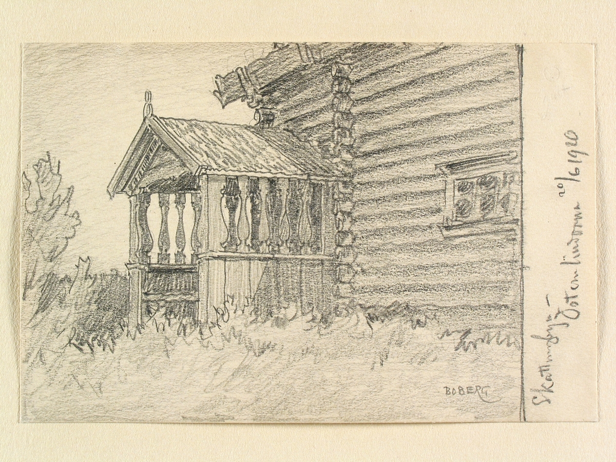 Dalarna, Orsa sn. "Skattungbyn, öst om lindorna". Boningshus. Teckning av Ferdinand Boberg