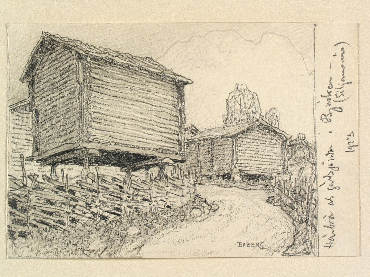 Dalarna, Siljansnäs sn. Härbre och gärdesgårdar i Björken. Teckning av Ferdinand Boberg