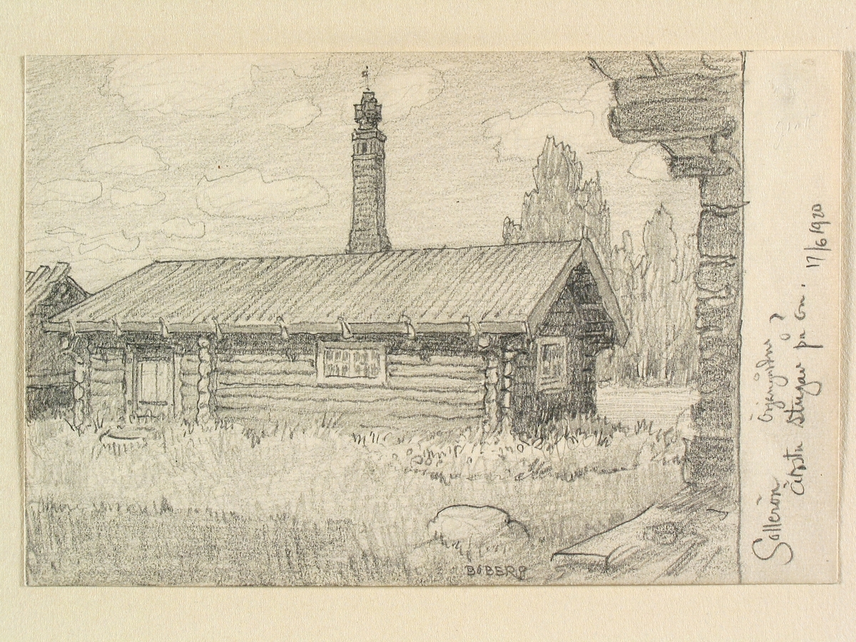 Dalarna, Solleröns sn., Sollerön, Örjangården. "Äldsta stugan på ön". Teckning av Ferdinand Boberg