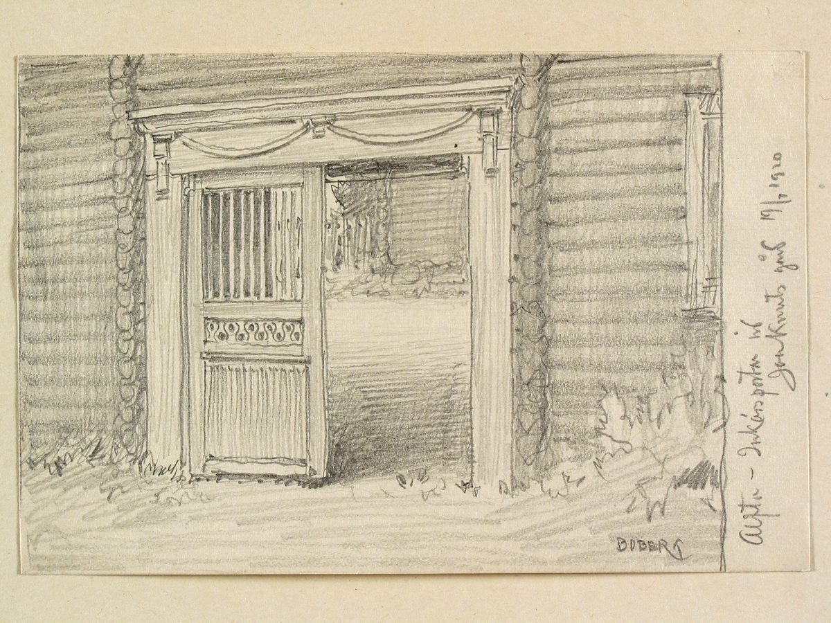 Hälsingland, Alfta. "Inkörsportar vid Jon Knuts gård". Teckning av Ferdinand Boberg