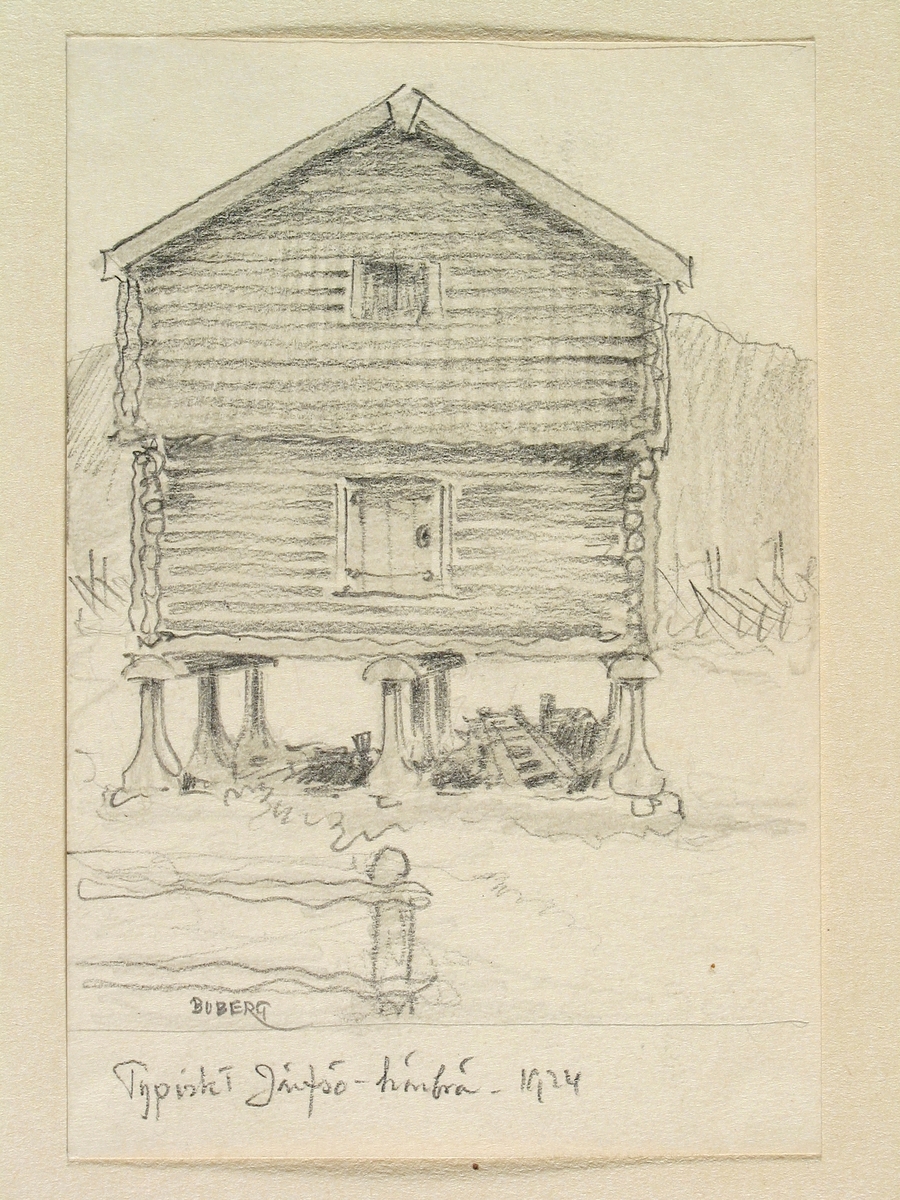 Hälsingland, Järvsö sn. "Typiskt Järfsö-härbrä". Teckning av Ferdinand Boberg