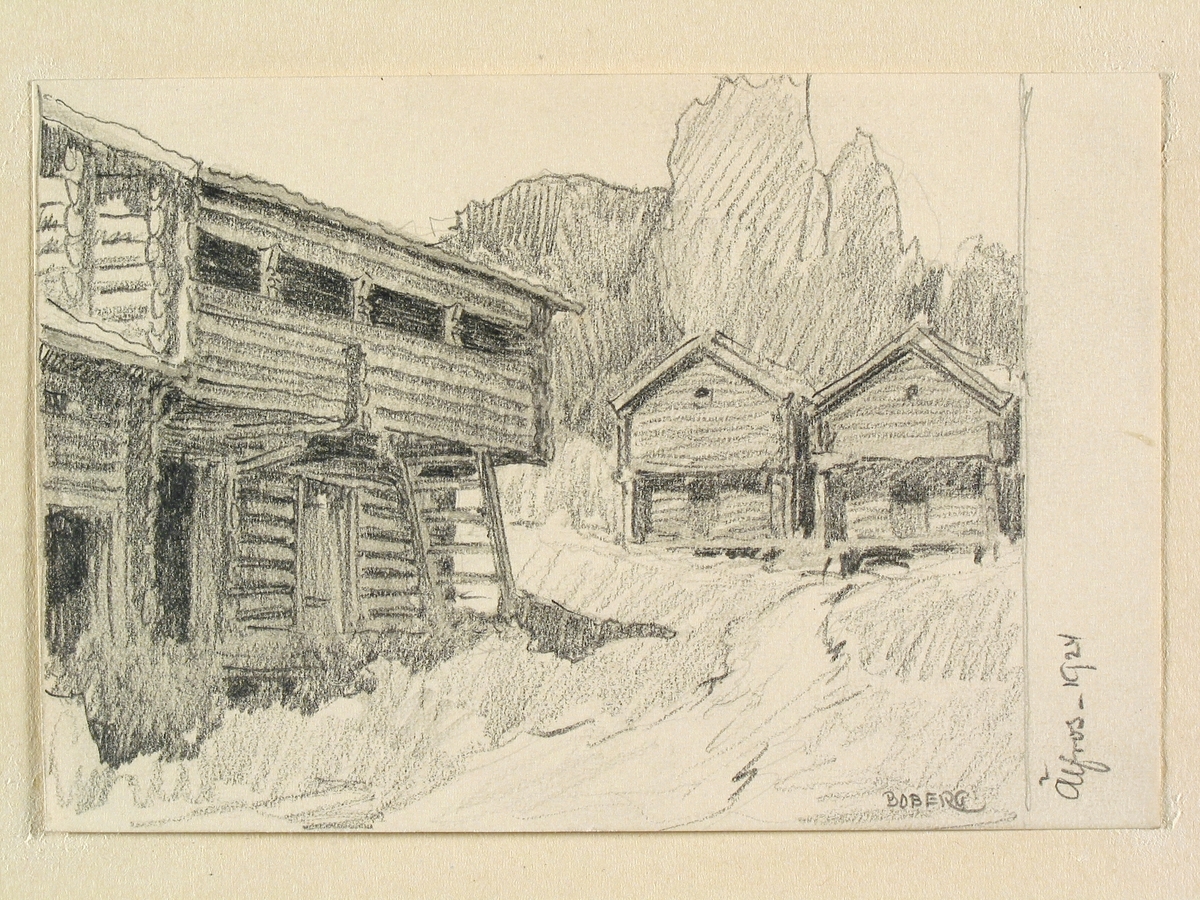 Härjedalen, Älvros. Svalbod och härbren. Teckning av Ferdinand Boberg