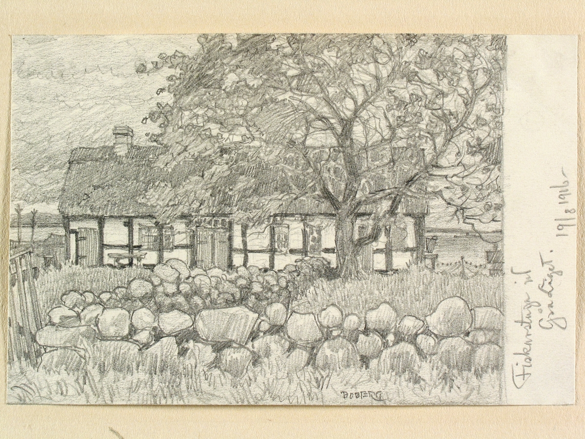 Skåne, Luggude hd., Allerums sn., Gråläge. Korsvirkeshus. Teckning av Ferdinand Boberg.