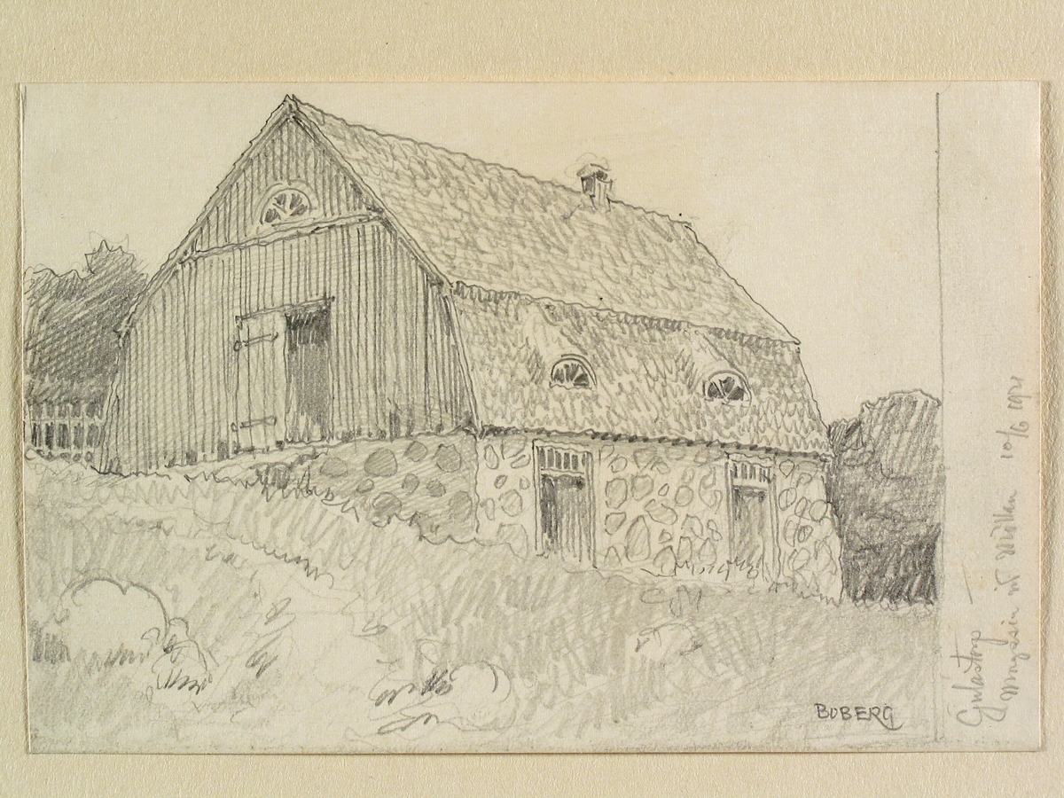 Skåne, V. Göinge hd., Ignaberga sn., Gulastorp. Magasin vid möllan. Teckning av Ferdinand Boberg.