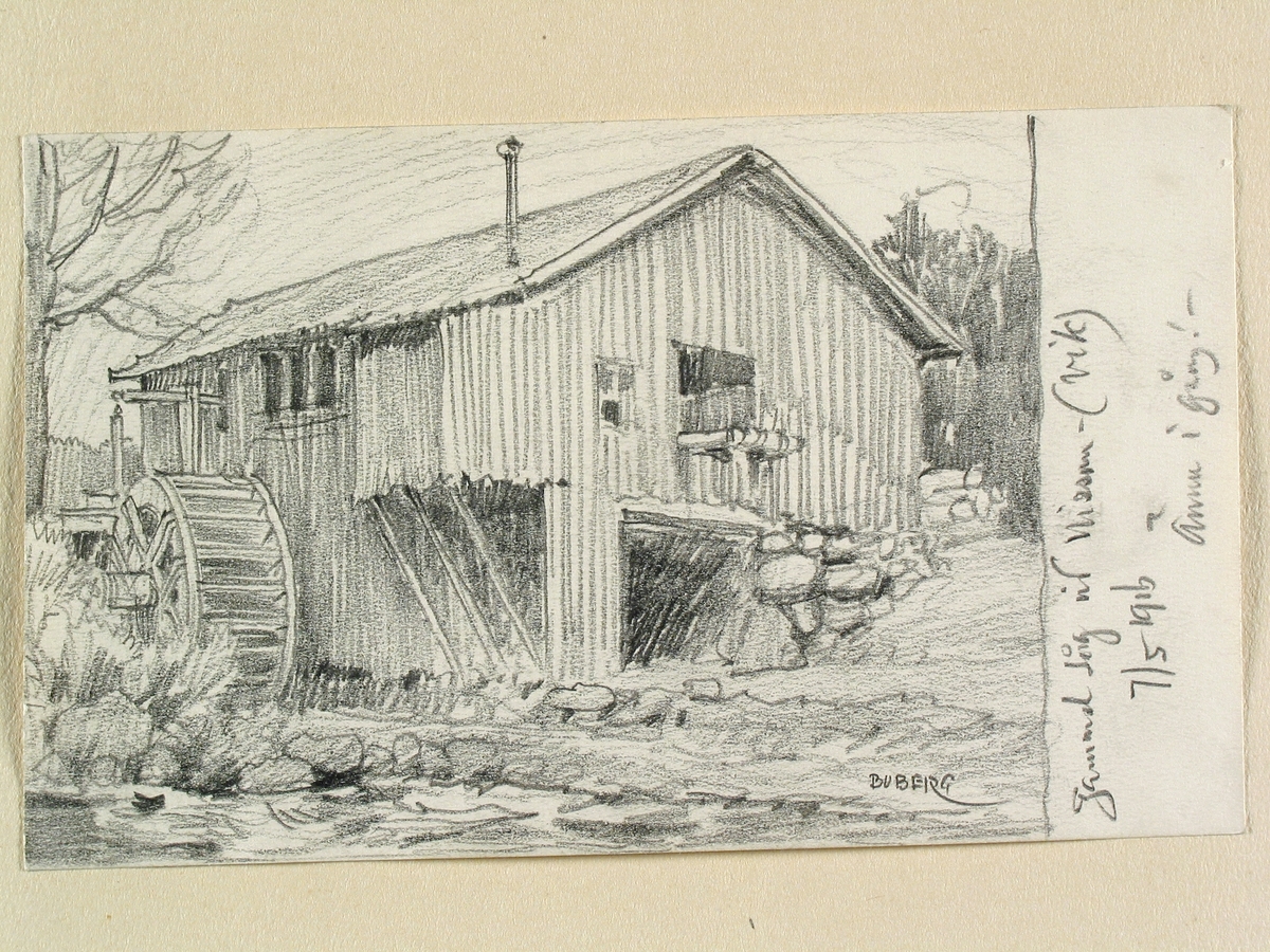 Småland, Mo hd., Hestra sn. Gammal såg vid Nissan (Vik). Teckning av Ferdinand Boberg.