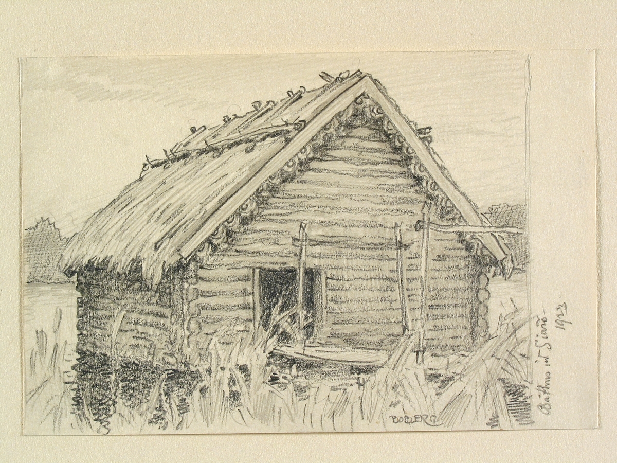Uppland, Åkers skplg., Ljusterö sn. "Båthus vid Siarö". Teckning av Ferdinand Boberg
