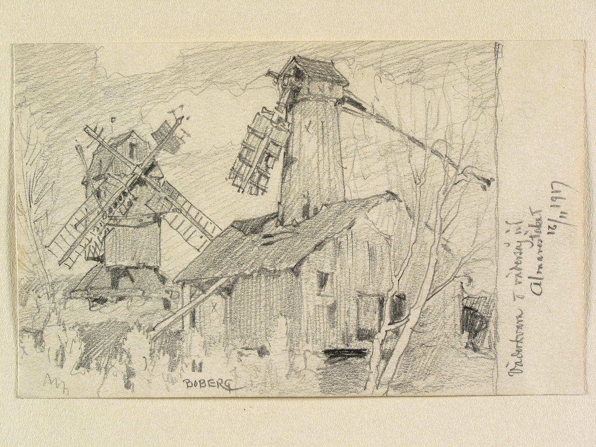 Uppland, Bro hd., Näs sn. "Väderkvarn och vädersåg vid Almarestäket". Teckning av Ferdinand Boberg