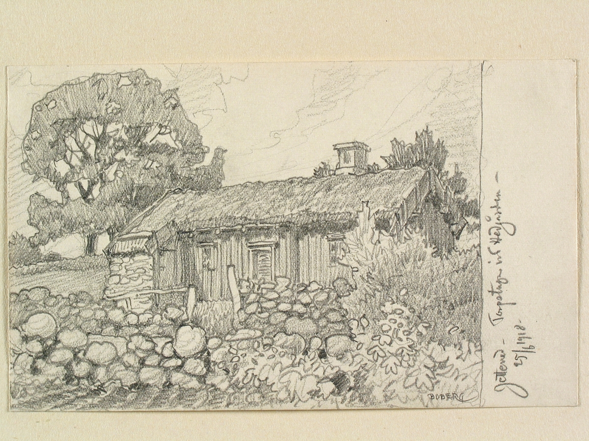 Västergötland, Gudhems hd., Friggeråkers sn., Jättened. "Torpstuga vid Hedgården". Teckning av Ferdinand Boberg.