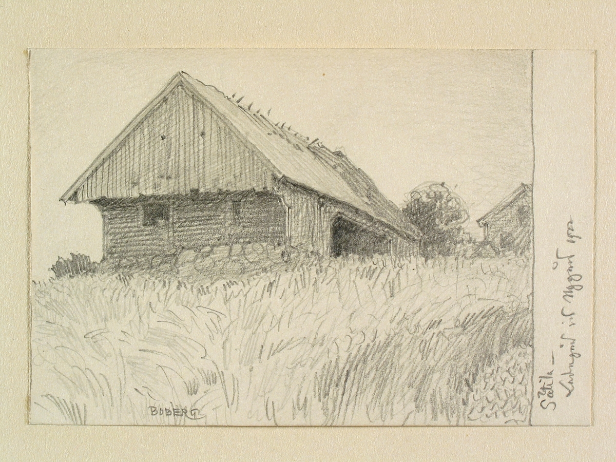 Västergötland, Marks hd., Sätila sn. "Ladugård vid Nygård". Teckning av Ferdinand Boberg.