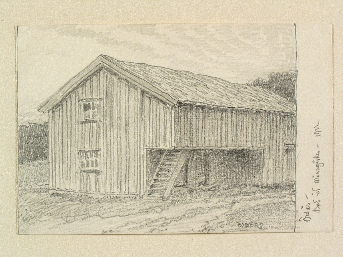 Västergötland, Kinds hd., Örsås sn. "Bod vid Månsgården". Teckning av Ferdinand Boberg.