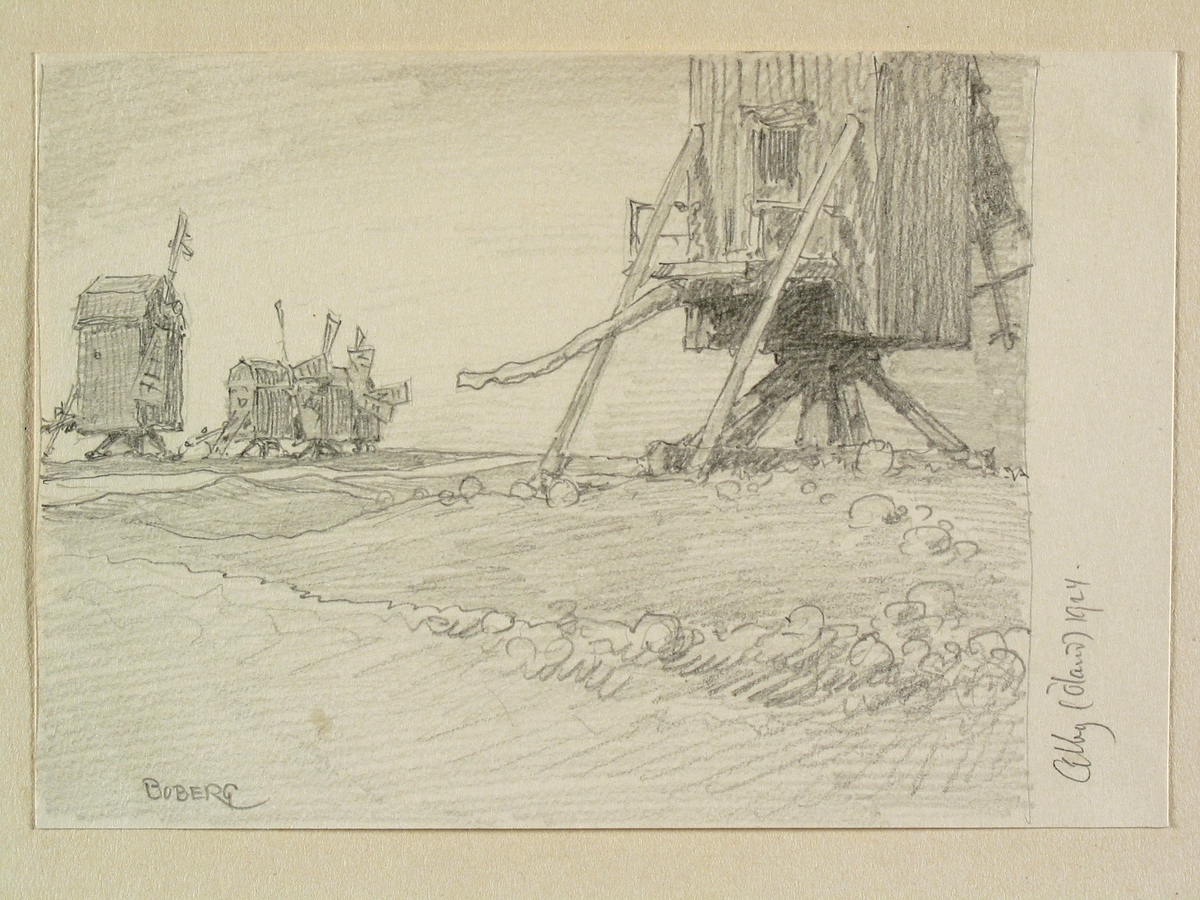 Öland, Möckleby hd., Hulterstads sn., Alby. Väderkvarnar. Teckning av Ferdinand Boberg.