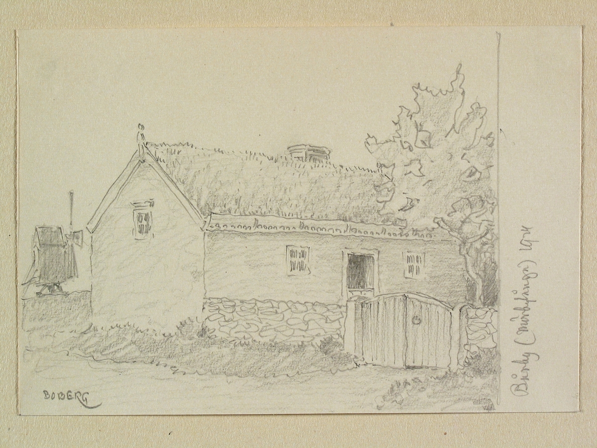 Öland, Algutsrums hd., Mörbylånga sn., Bårby. Hus, väderkvarn i bakgrunden. Teckning av Ferdinand Boberg.