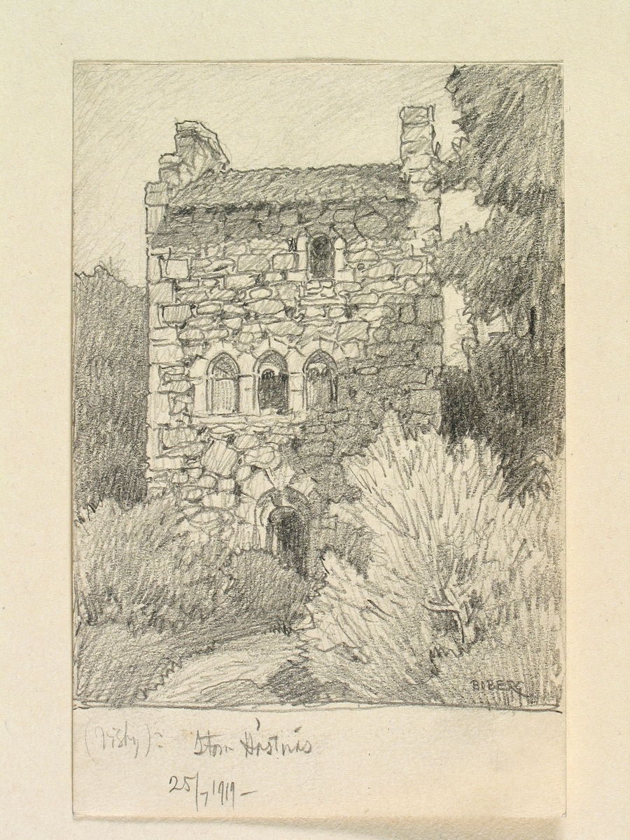 Gotland, Visby norra landsförsamling, Stora Hästnäs. Stenhus från 1300-talet. Teckning av Ferdinand Boberg