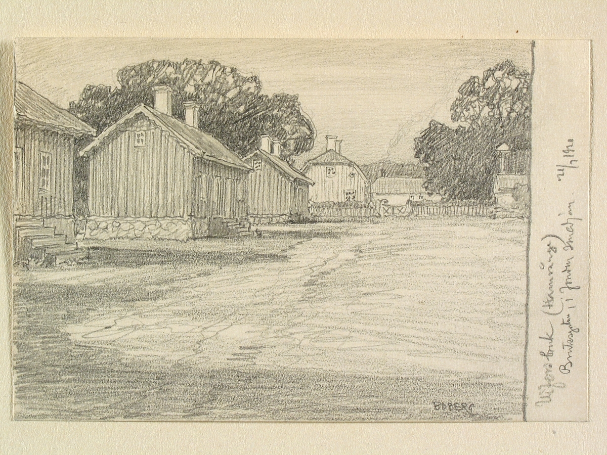 Gästrikland, Hamrånge sn., Vifors. "Bruksgatan, i fonden smedjan." Teckning av Ferdinand Boberg.