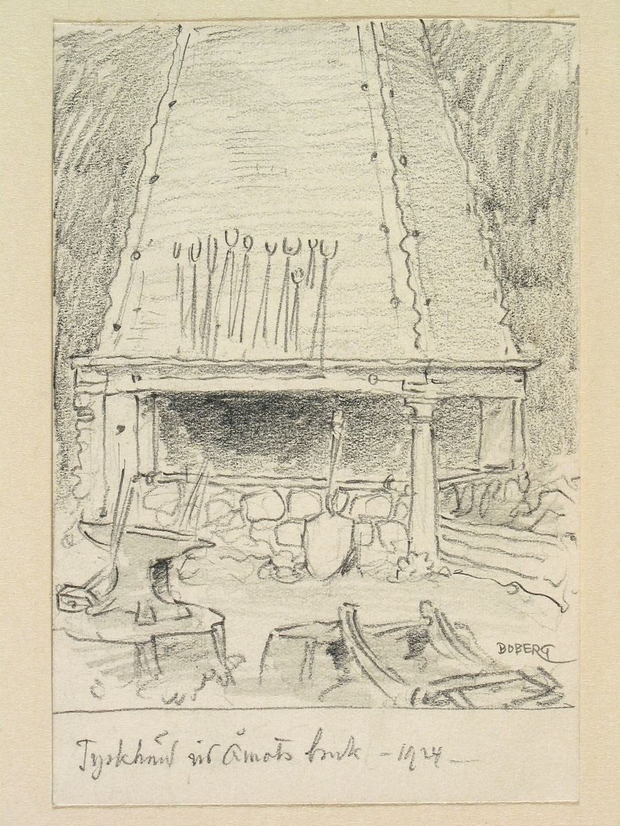 Gästrikland, Ockelbo sn., Åmots kapellförsamling. "Tyskhärd vid Åmots bruk". Teckning av Ferdinand Boberg.