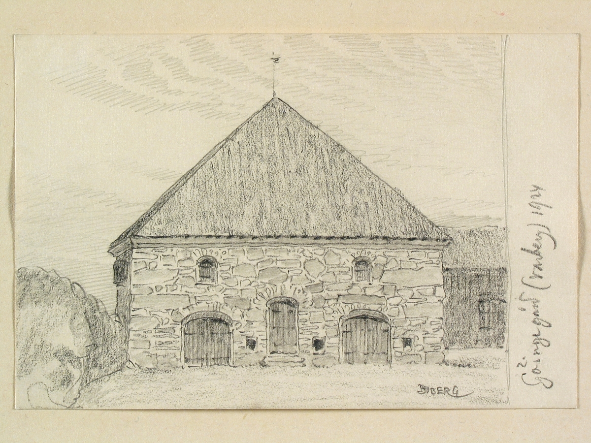 Halland, Himle hd., Lindbergs sn. Göingegården, magasin. Teckning av Ferdinand Boberg.