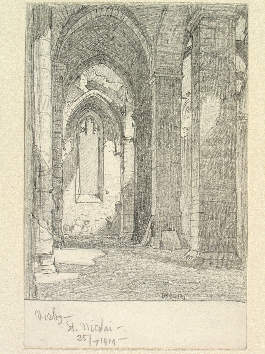 Teckning av Ferdinand Boberg. Visby, Nikolai kyrkoruin