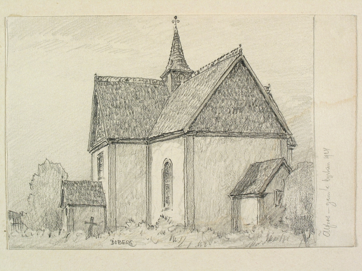 Härjedalen, Älvros gamla kyrka. Teckning av Ferdinand Boberg