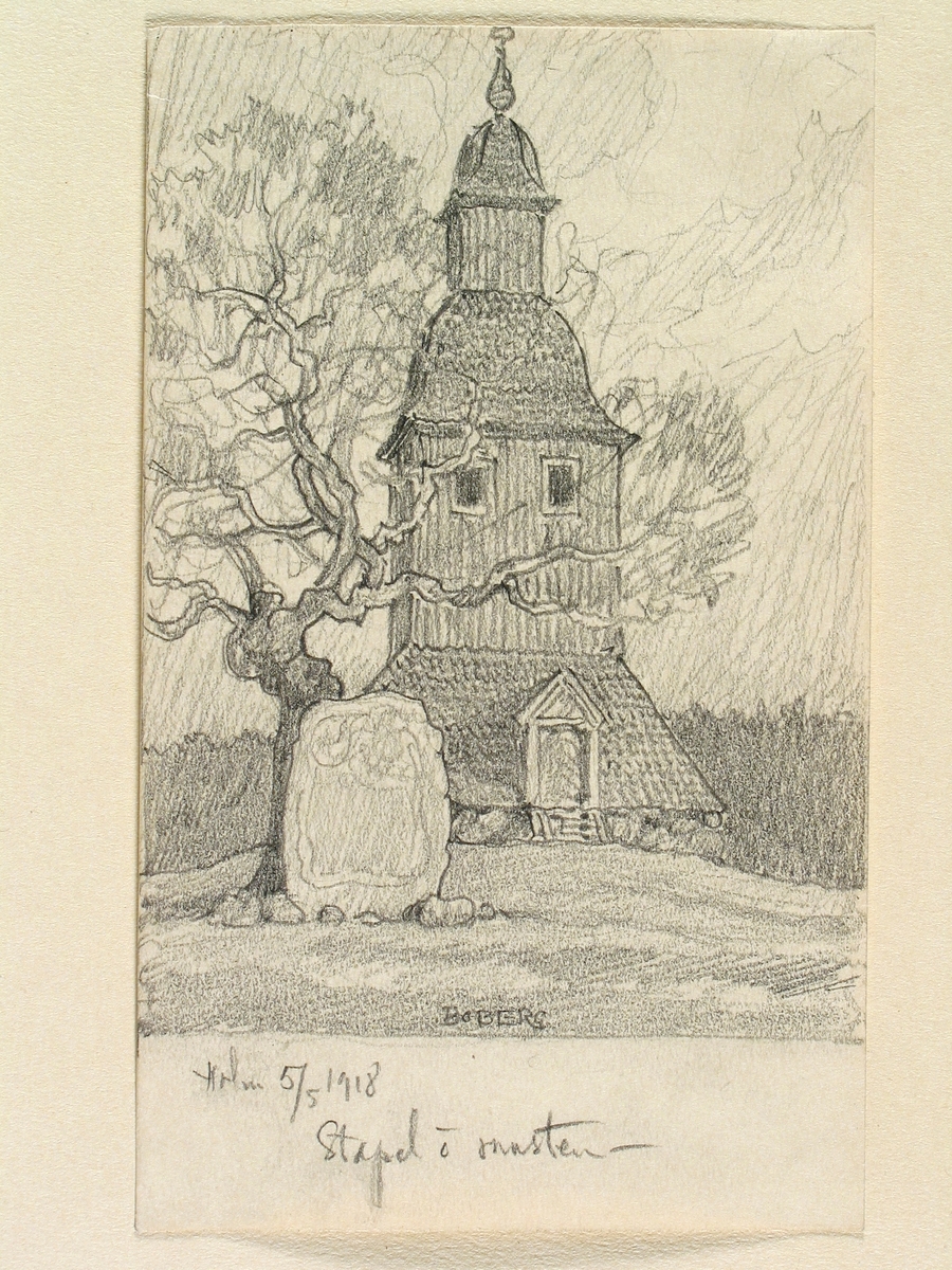 Teckning av Ferdinand Boberg. Uppland, Lagunda hd., Holms kyrka