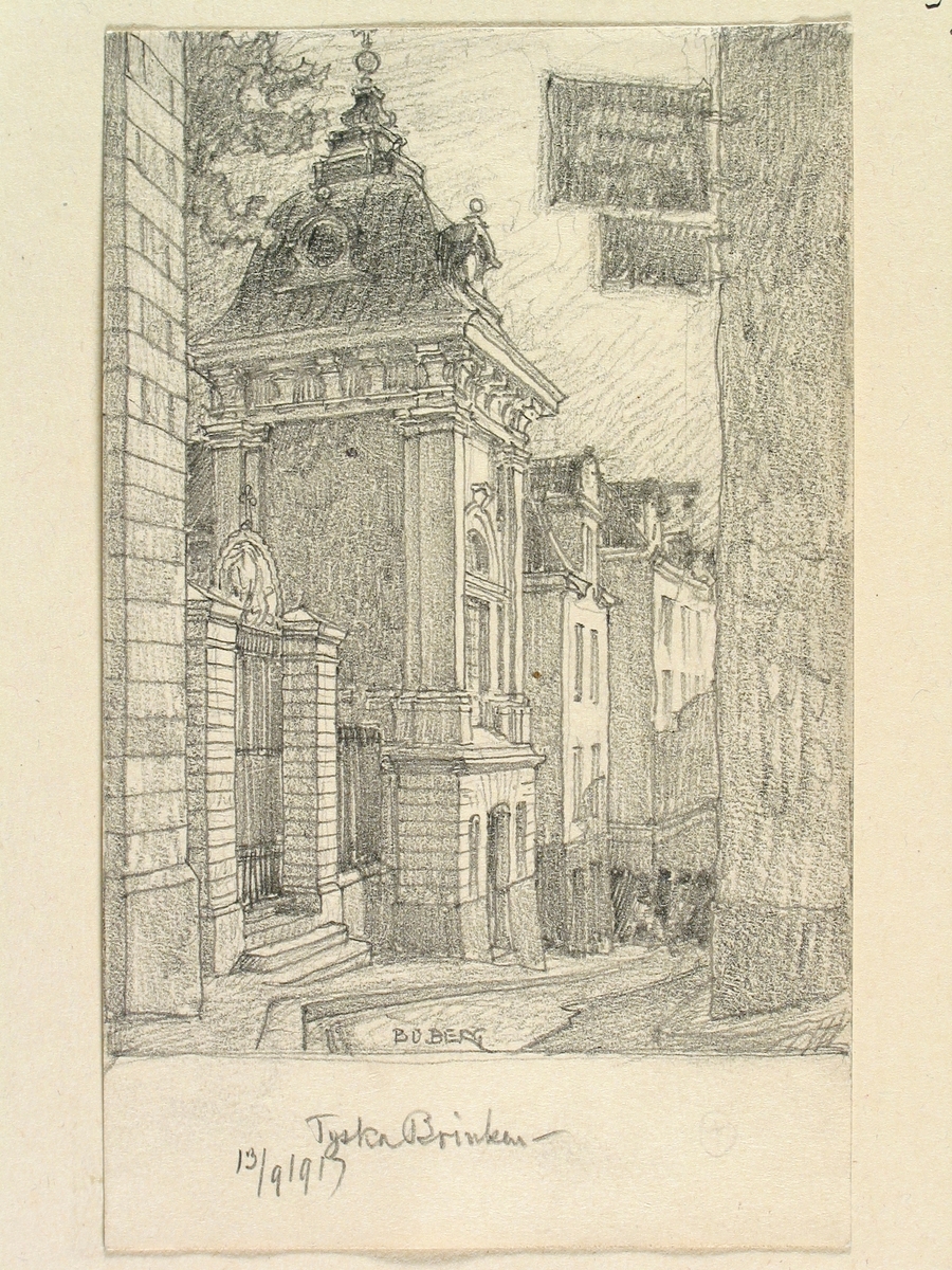 Teckning av Ferdinand Boberg. Stockholm, Satden inom br., Kv. Juno, Tyska kyrkan, Kapell vid Tyska kyrkan