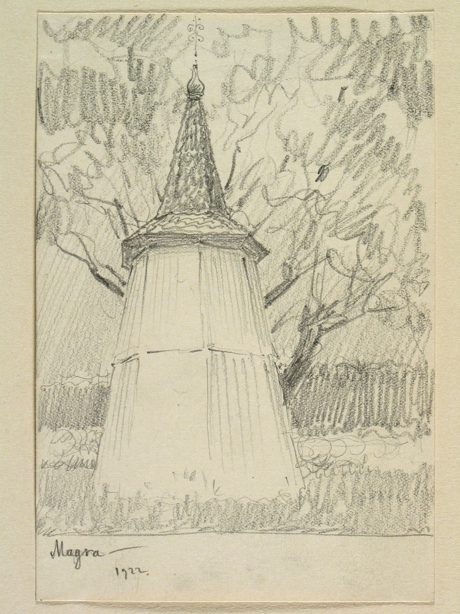 Teckning av Ferdinand Boberg. Västergötland, Bjerke hd., Magra kyrka, Stapeln