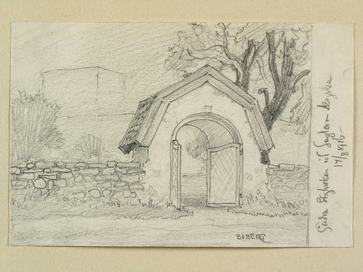 Teckning av Ferdinand Boberg. Västergötland, Marks hd., Seglora kyrka , Södra stigluckan
