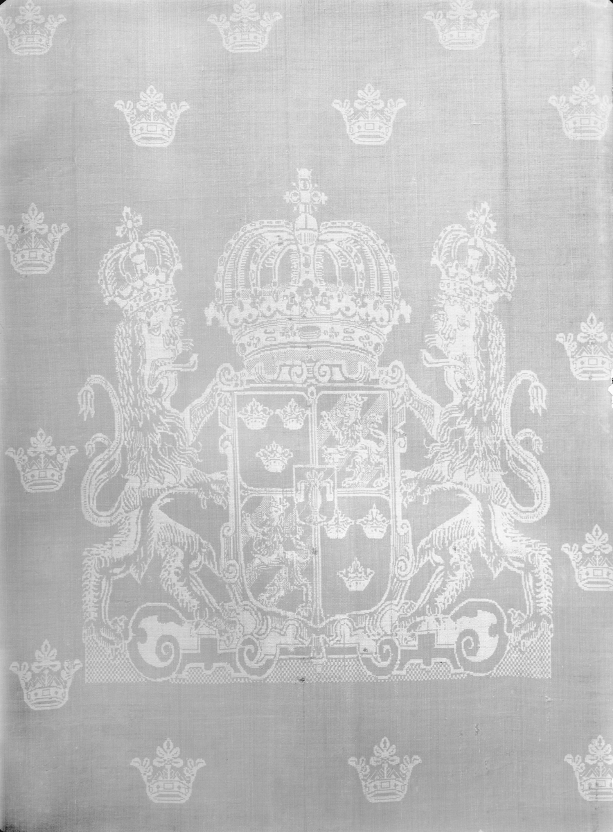 Fragment av duk med stora riksvapnet, en hjärtsköld flankerat av lejon. Runt detta strödda kronor.