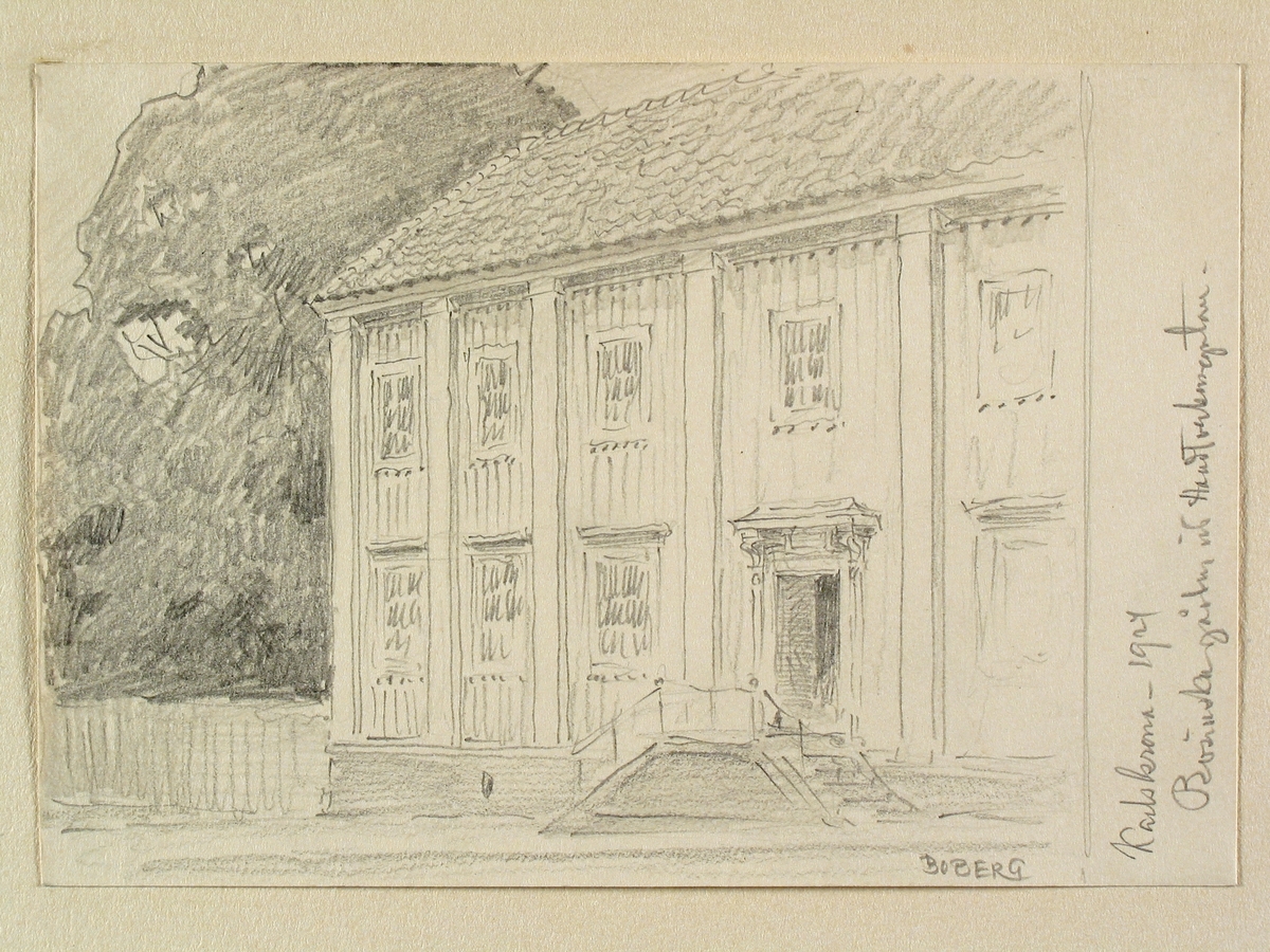 Teckning av Ferdinand Boberg. Karlskrona, Hantverkargatan, Bosinska gården