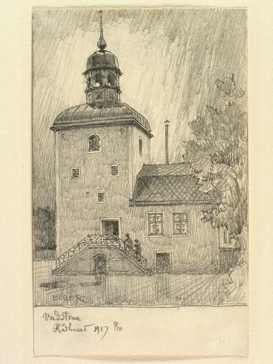 Teckning av Ferdinand Boberg. Vadstena, Rådhuset