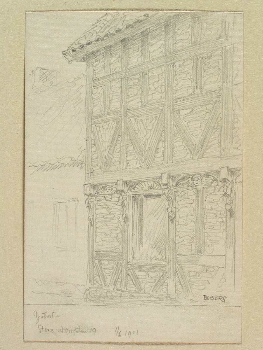 Teckning av Ferdinand Boberg. Ystad, Stora Norrgatan