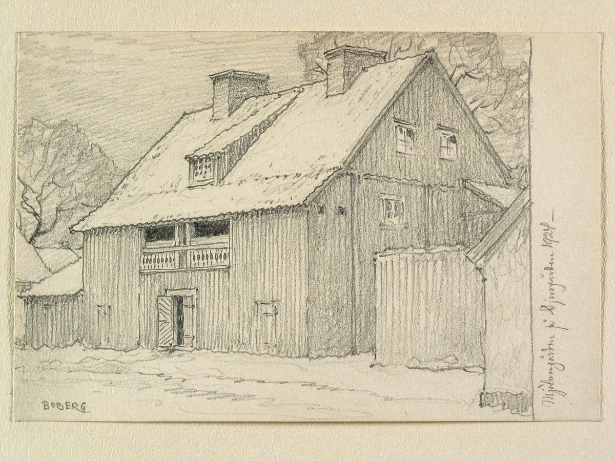 Teckning av Ferdinand Boberg. Stockholm, Djurgården, Kv. Trädgården, Allm. gränd