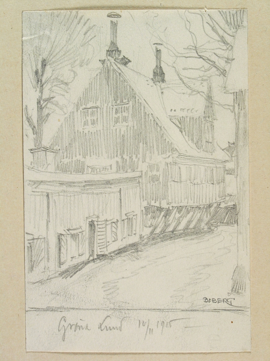 Teckning av Ferdinand Boberg. Stockholm, Djurgården , Kv. Trädgården, Långa Gatan 2 och 4, Gröna Lund
