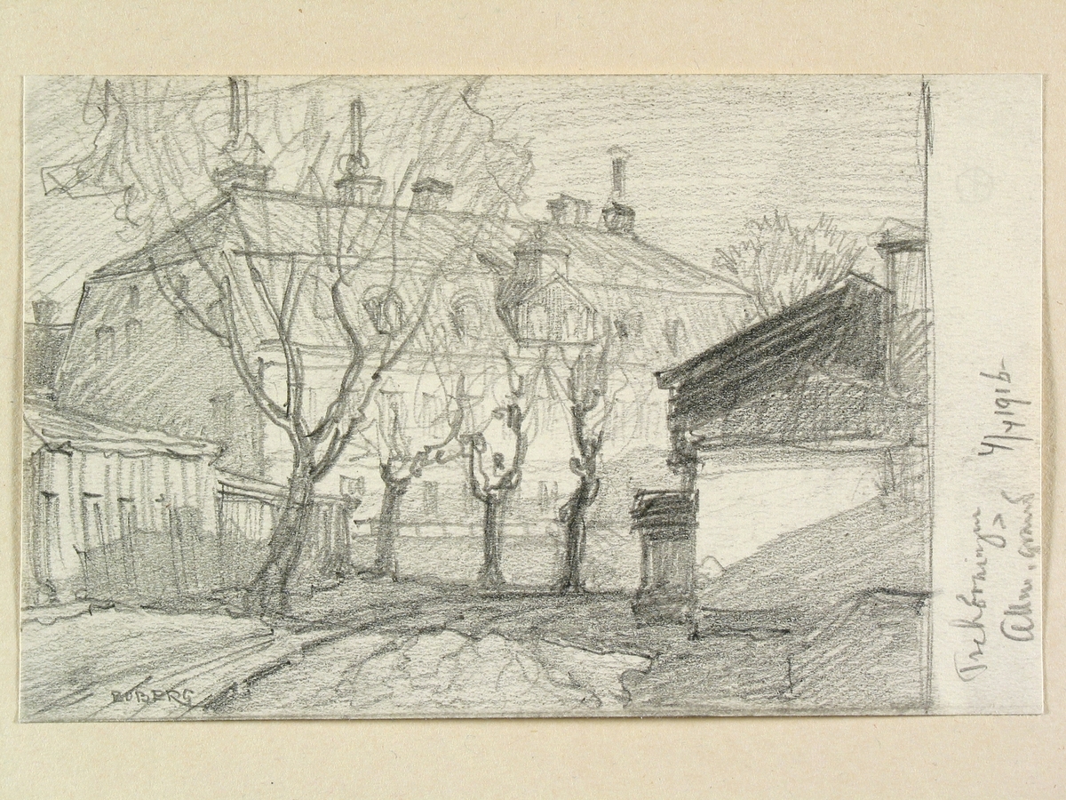 Teckning av Ferdinand Boberg. Stockholm, Djurgården , Kv. Lodsachska varvet, (f.d. Trehörningen), Långa Gatan , enl. adresskod. ,