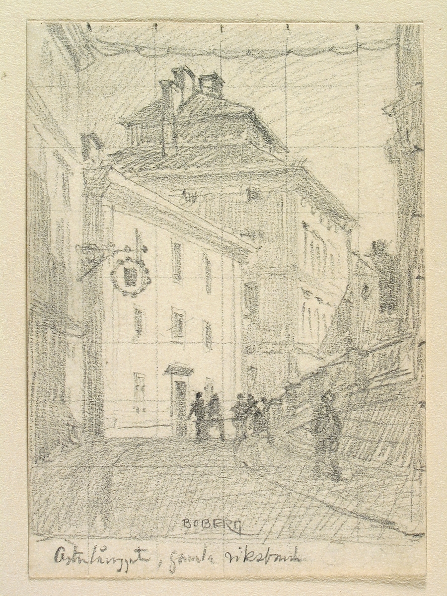 Teckning av Ferdinand Boberg. Stockholm, Staden in. br., Österlånggatan, G:la riksbanken