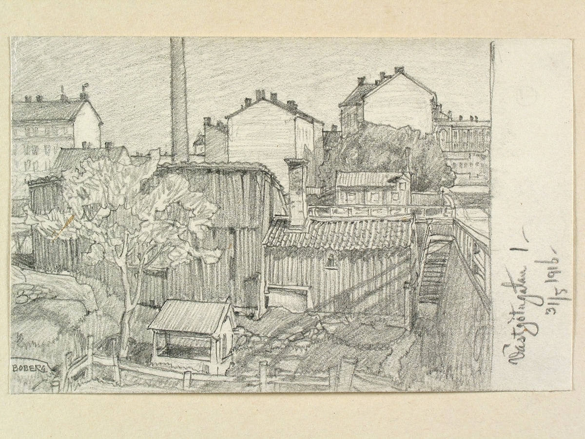 Västgötagatan 1, Folkungagatan 2 Kvarteret Nattugglan, Stockholm, Södermalm,Teckning av Ferdinand Boberg.