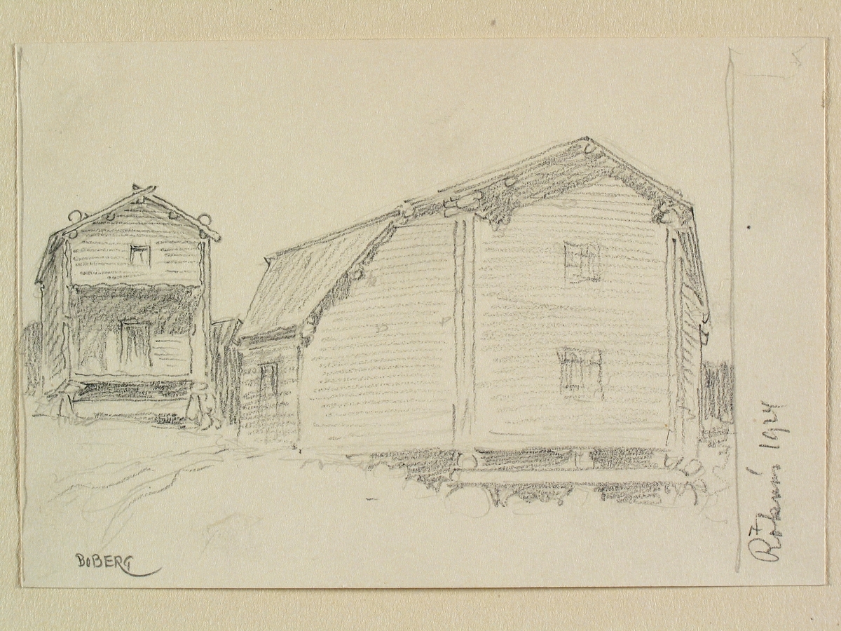 Bebyggelse i Roknäs, Norrbotten. Teckning av Ferdinand Boberg