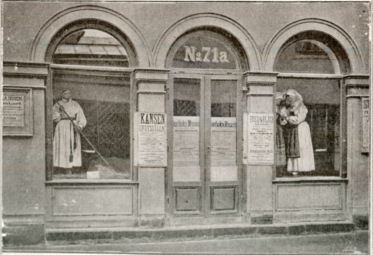 Nordiska museets entré i södra paviljongen, Drottninggatan 71 A 1898 med dräktdockor i fönstren. Ur Ny Illustrerad Tidning 1898.