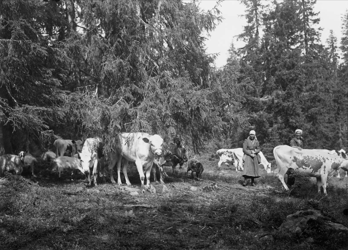 "Emmy Eriksson, sedermera gift G. Renström, och Selma Forsman i Lybergets fäbod."