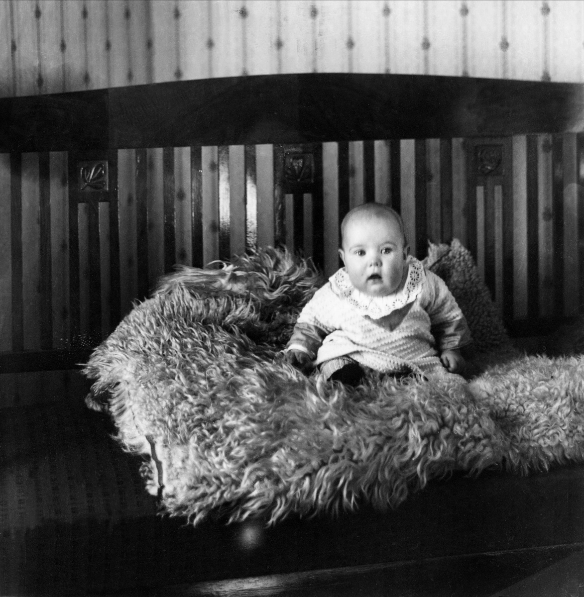 Greta Larsson (Pål Gunnars fru)." En liten baby som sitter på en skinnfäll