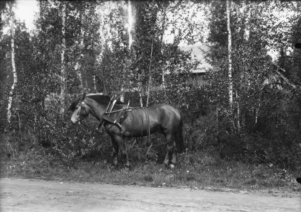 Häst" som står vid en grusväg