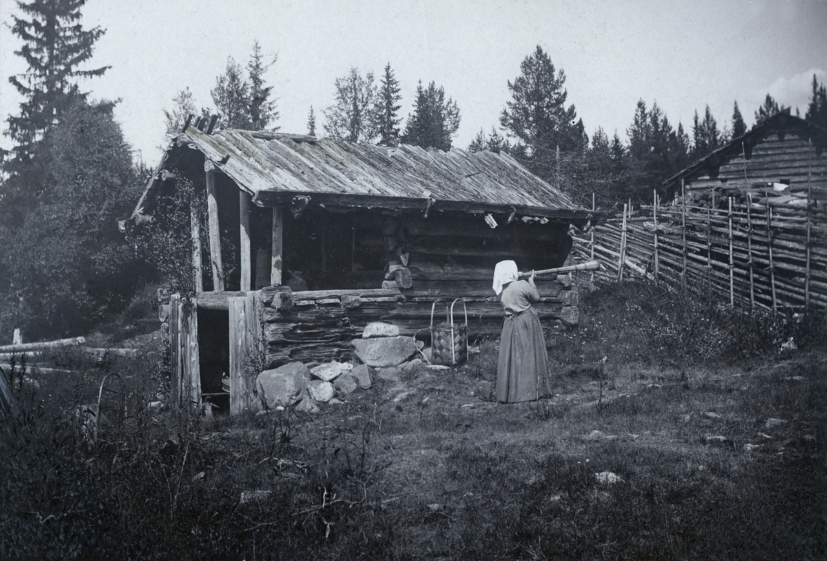 Vallkulla blåsande på lur bakom mjölkstuga på Baltsars fäbod i Älvdalen.