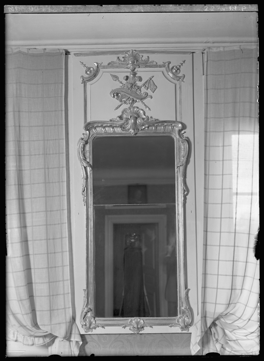 Stora Eks Herrgård i Västergötland. Detalj, spegel samt gardiner.